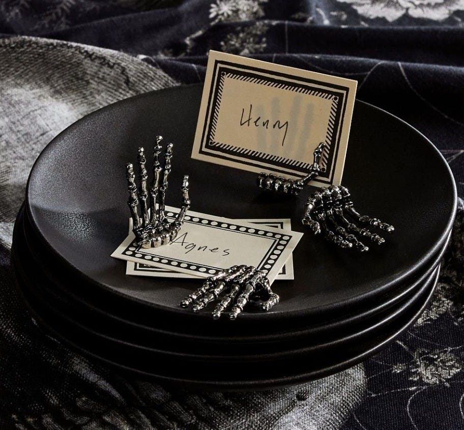 Equal parts eerie and elegant, these little skeletal hands are the ultimate Halloween dinner party touch. I can already picture them resting on black plates or nestled into mossy charger trays. If theyâre still around next month, Iâll be grabbing a set.