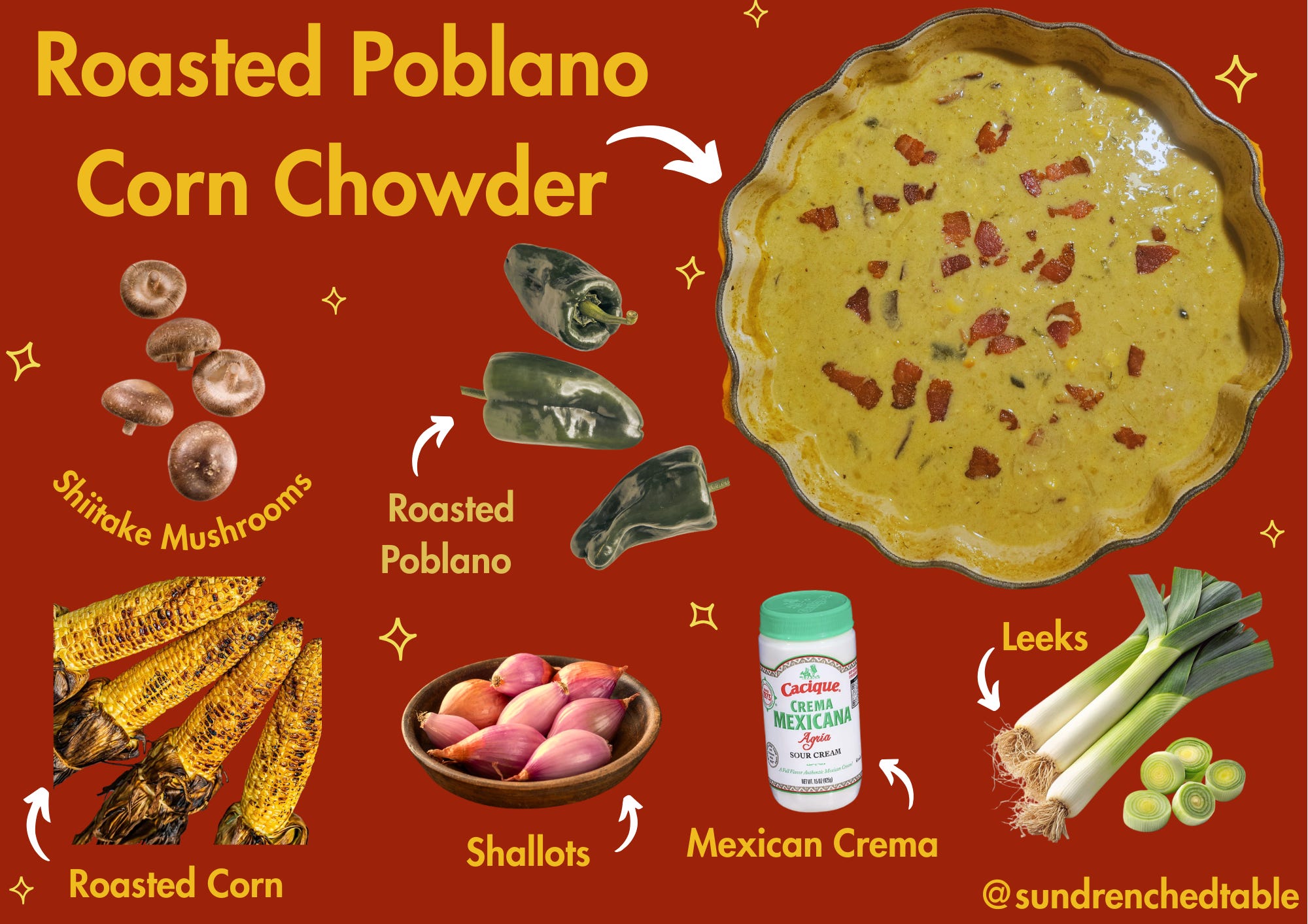 Roasted Poblano Corn Chowder. A comforting yet elevated corn chowder layered with smoky roasted poblano, roasted corn, bacon, shiitake mushrooms, leeks, shallots, white wine and fresh thyme. Creamy, flavorful, and perfect for late summer into fall.