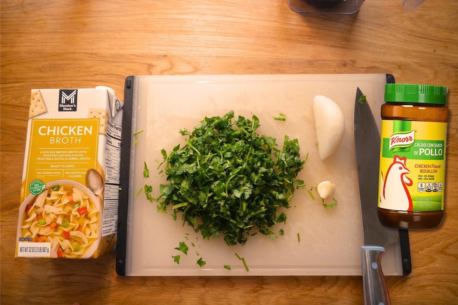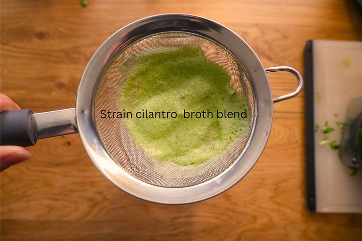 1 cup of cilantro, 1/4 piece of a white onion, 1 garlic clove, 1 tsp of Knorr chicken bouillon and 2 cups of chicken broth.