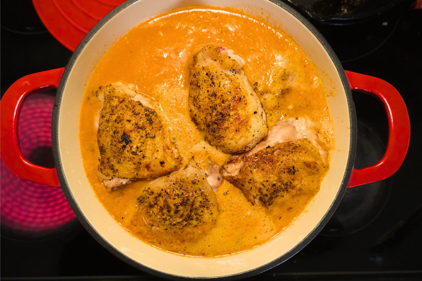 Ideally, the sauce should come halfway up the chicken — but honestly, I don’t stress about this. I cook this in large batches so I don’t worry about this part much.