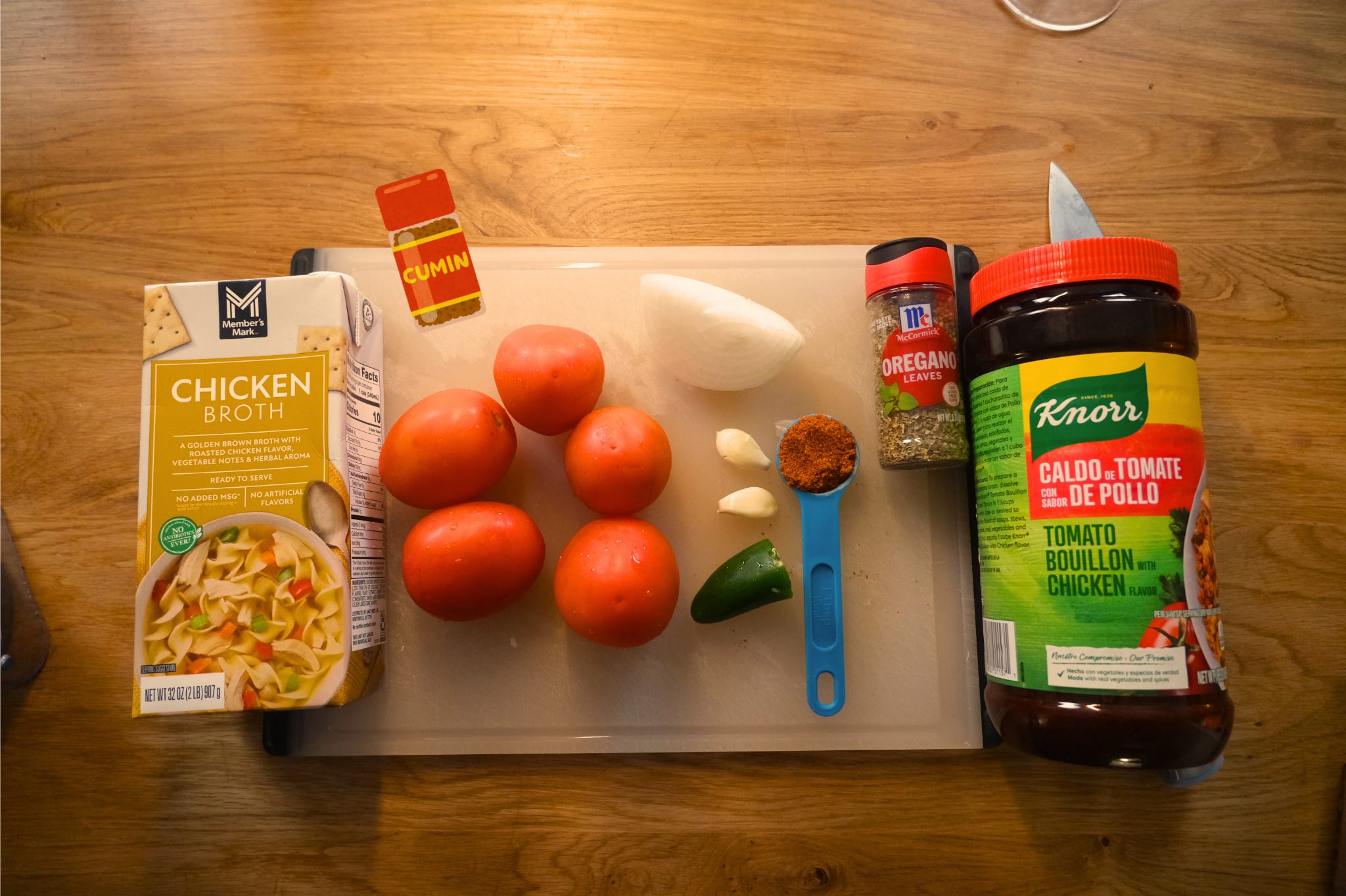 Option 2 (Bright flavor): Add 1.5 pounds (700 grams) of tomatoes to the blender along with 1/4 piece of a white onion, 1 jalapeño pepper, 2 garlic cloves, 1 tbsp of Knorr Tomato Bouillon, 3 cups of chicken broth, 1/2 tsp Mexican oregano, 1/4 tsp ground cumin. Blend until smooth and set aside.