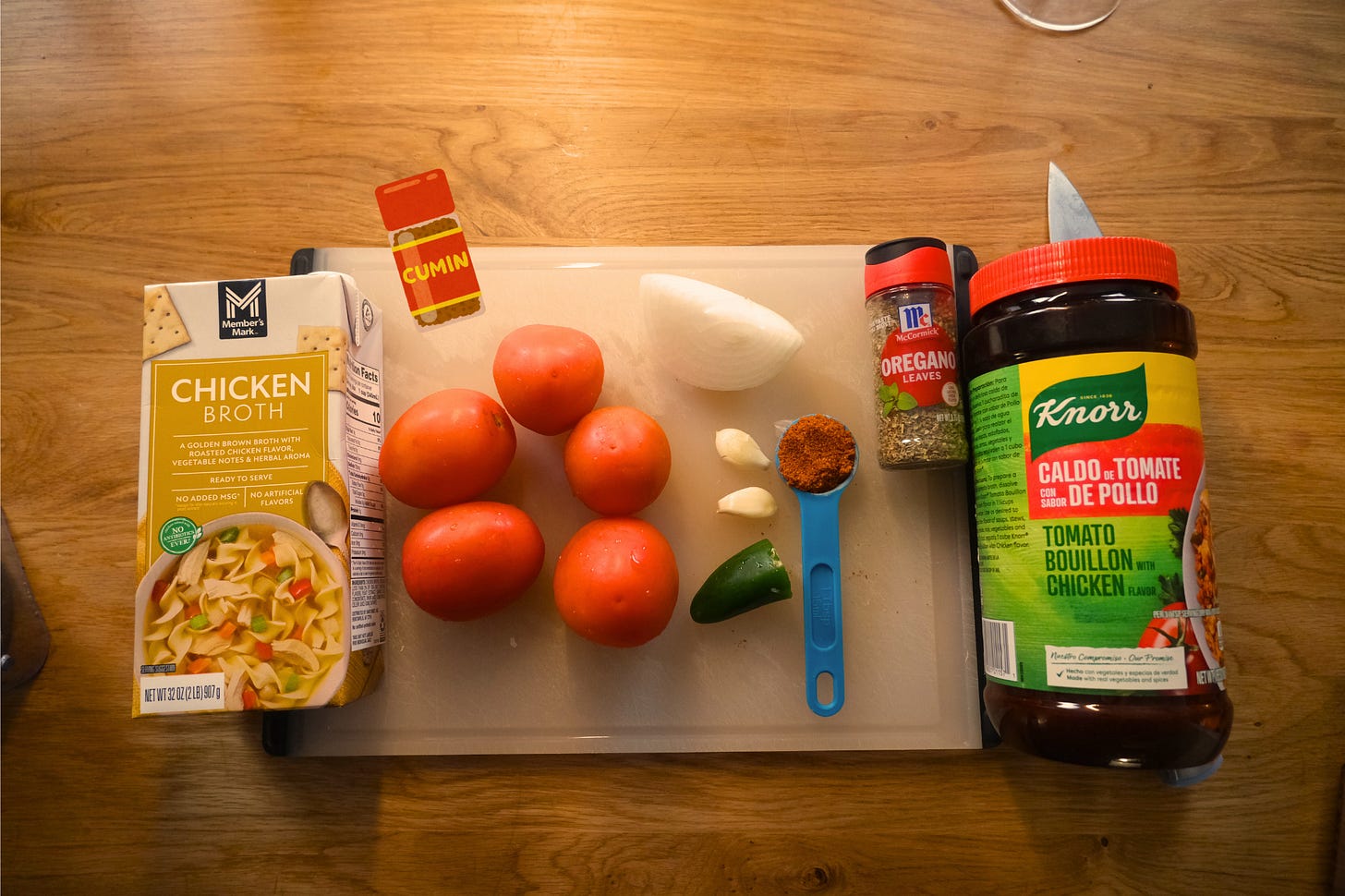 Option 1 (Deeper flavor, Smoky): In a large skillet, heat 1 tbsp olive oil over medium heat. Add 1.5 pounds (700 grams) of tomatoes, 1/4 piece of a white onion, 1 jalapeño pepper, and 2 garlic cloves. Let everything char slightly — this builds depth. Transfer everything to your blender, add 1 tbsp of Knorr Tomato Bouillon, 3 cups of chicken broth, 1/2 tsp Mexican oregano, 1/4 tsp ground cumin and blend until smooth and set aside.