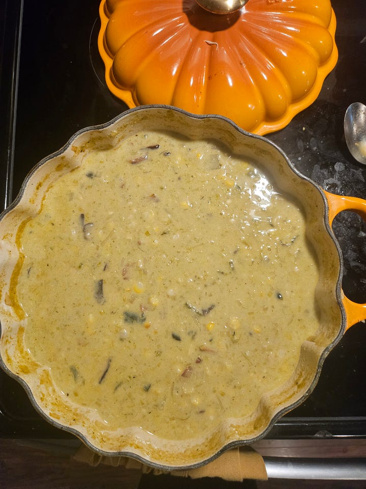 What came together is a chowder that feels like a conversation: smoky corn and poblano from Mexico, layered with French touches of thyme, leeks, mushrooms, and wine. It’s rustic and resourceful, but also surprisingly elegant — the kind of bowl that feels as much at home on a cozy weeknight table as it does at a dinner party.