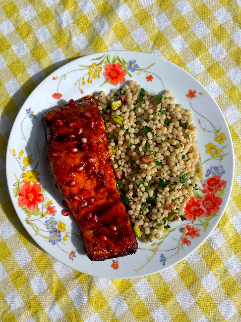 There’s a certain kind of dinner that belongs to the light right before nightfall. When the sky leans peach, the table catches the last sunbeam, and everything slows down. This is that kind of meal. The salmon is brushed with a glaze of Cara Cara orange, red grapefruit, honey and a kiss of pomegranate molasses, then roasted until just golden and caramelized at the edges. Pomegranate arils sparkle overtop like scattered rubies, catching the light and adding just the right crunch. Beneath it all, a bed of herbed couscous with lemon zest, pistachios, and parsley soaks up every drop. It’s not just dinner, its a ritual of color, scent, and warmth.