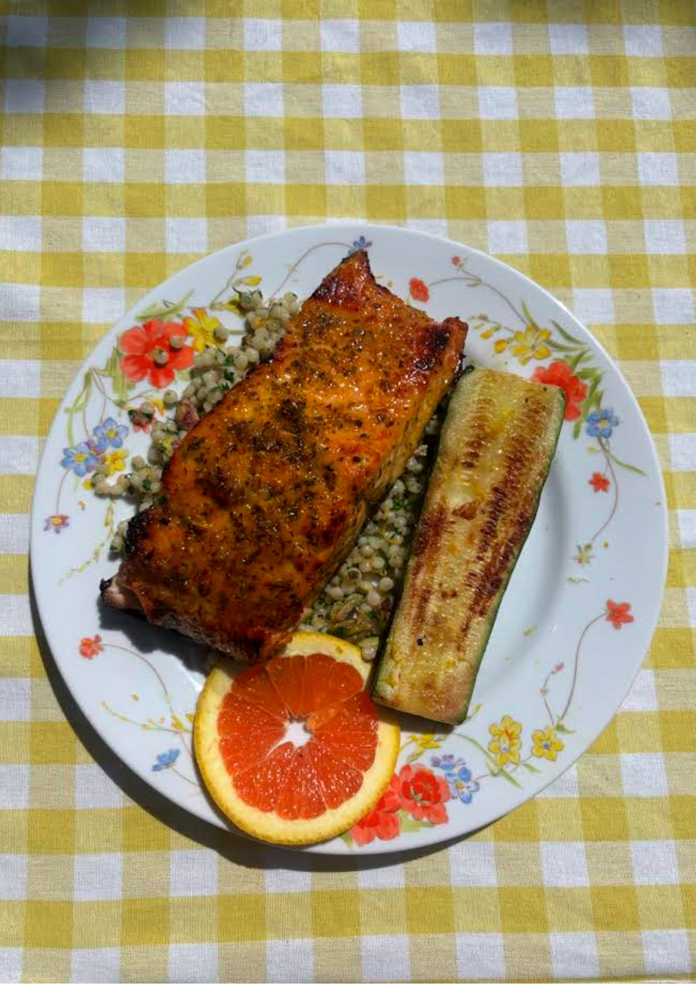Inspired by the simplicity of Tuscan cooking, this recipe layers sweet citrus with earth and fire. We brush salmon with a rustic glaze of orange juice, honey, rosemary, and olive oil, then roast it until golden and aromatic. It’s served alongside grilled zucchini kissed with lemon and sea salt.